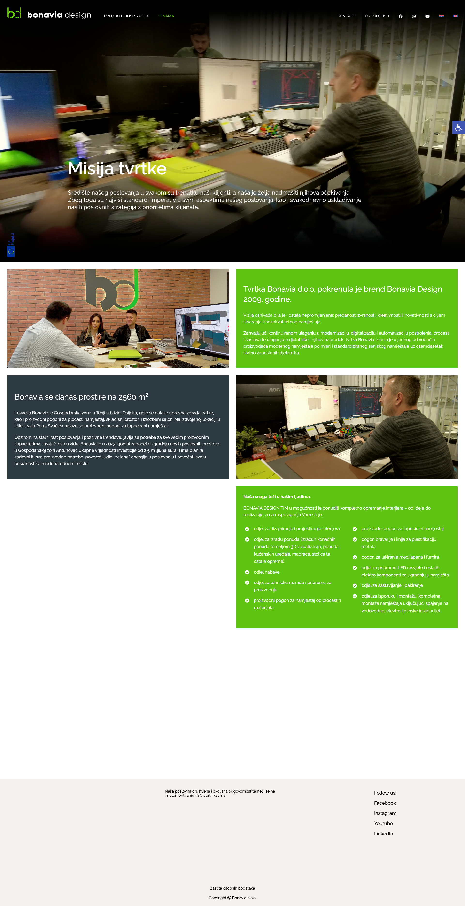 BONAVIA Ltd. je vodeća tvrtka u Hrvatskoj, specijalizirana za izradu visokokvalitetnog namještaja po mjeri i uređenje interijera. Smještena u Gospodarskoj zoni Tenja, blizu Osijeka, BONAVIA Ltd. nudi inovativna rješenja za svaki prostor, ističući se vrhunskom kreativnošću i predanošću izvrsnosti. S osamdesetak zaposlenika i preko 2560 m2 proizvodnih pogona, BONAVIA Ltd. je sinonim za pouzdanost i kvalitetu.