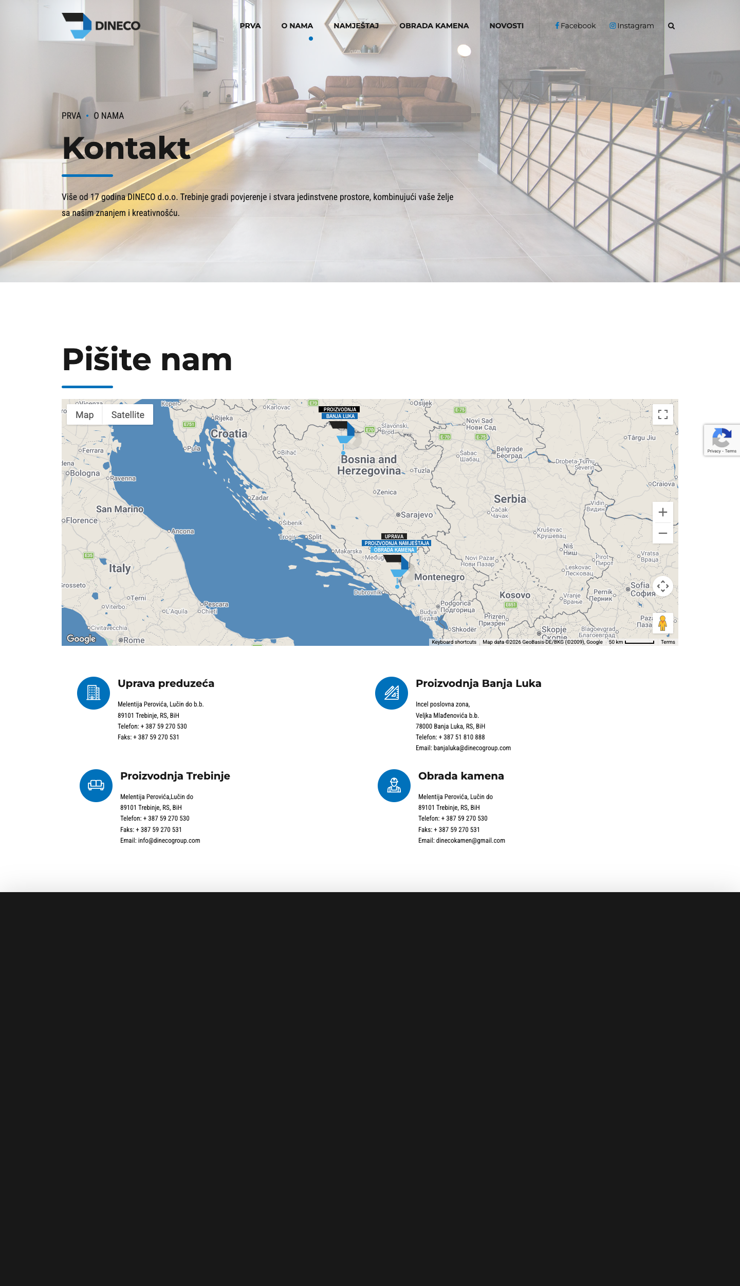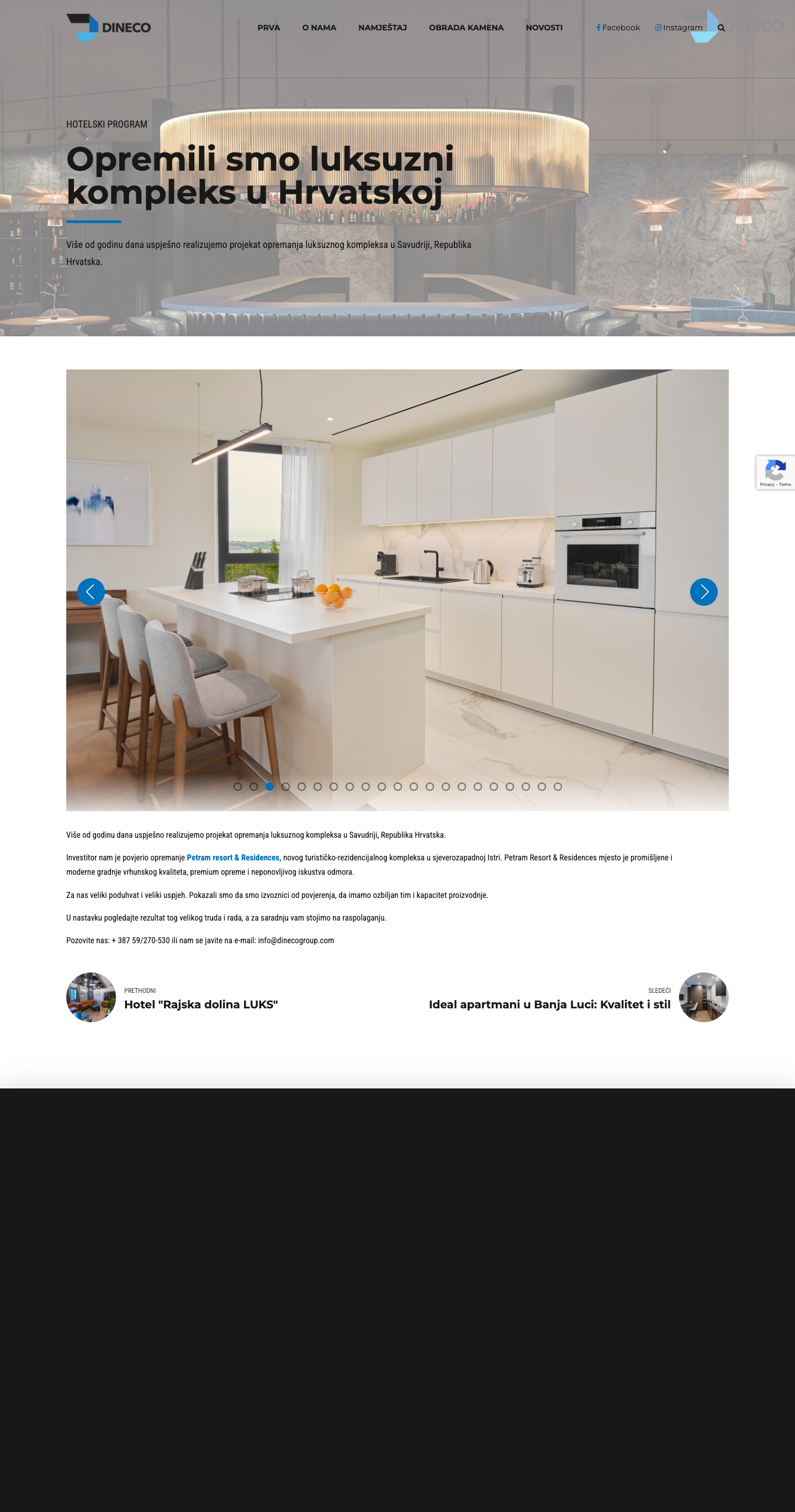 Dineco pruža kompletne usluge dizajna enterijera uključujući izradu kuhinja i namještaja po mjeri, 3D vizualizaciju, obradu prirodnog kamena, isporuku i montažu na lokaciji klijenta.