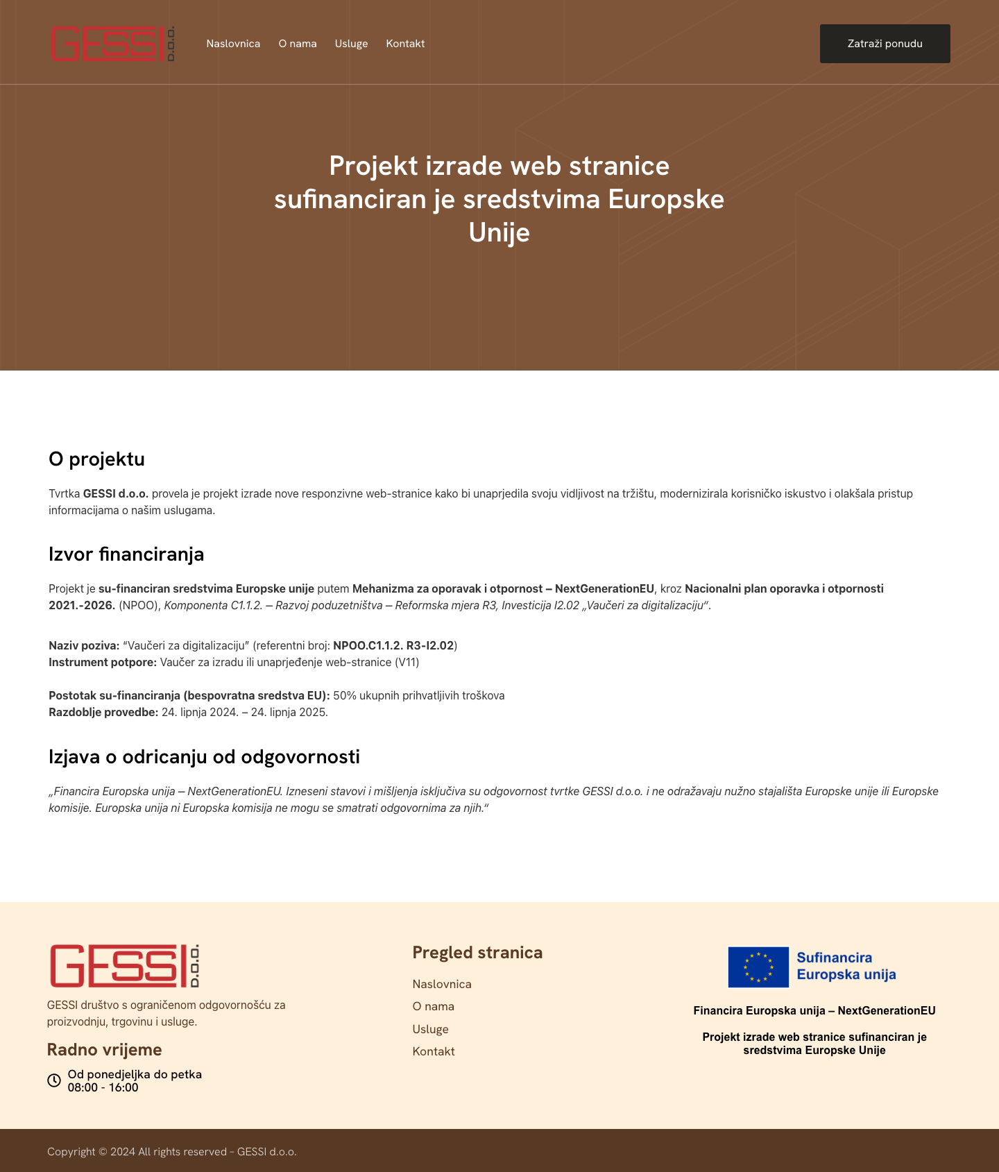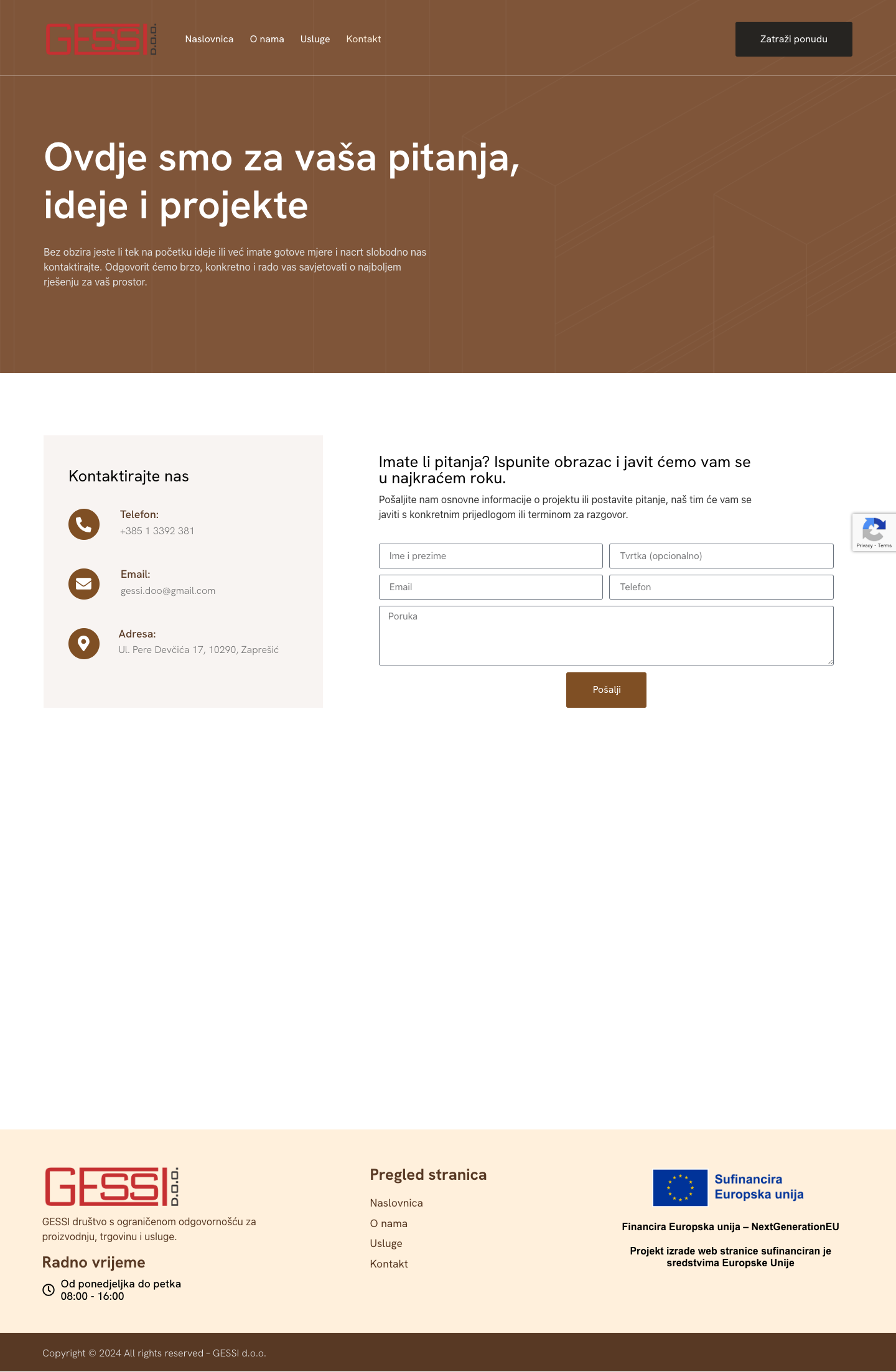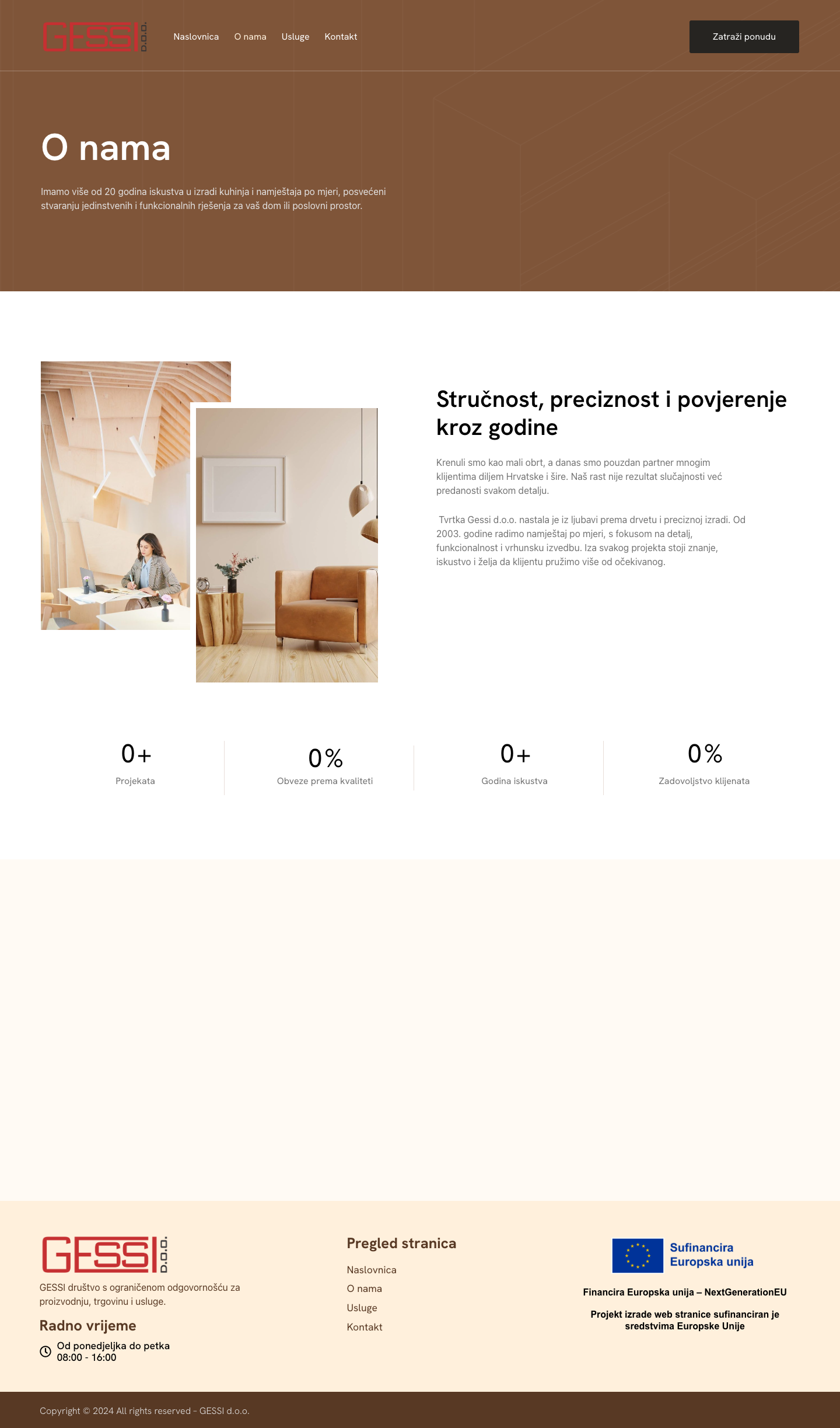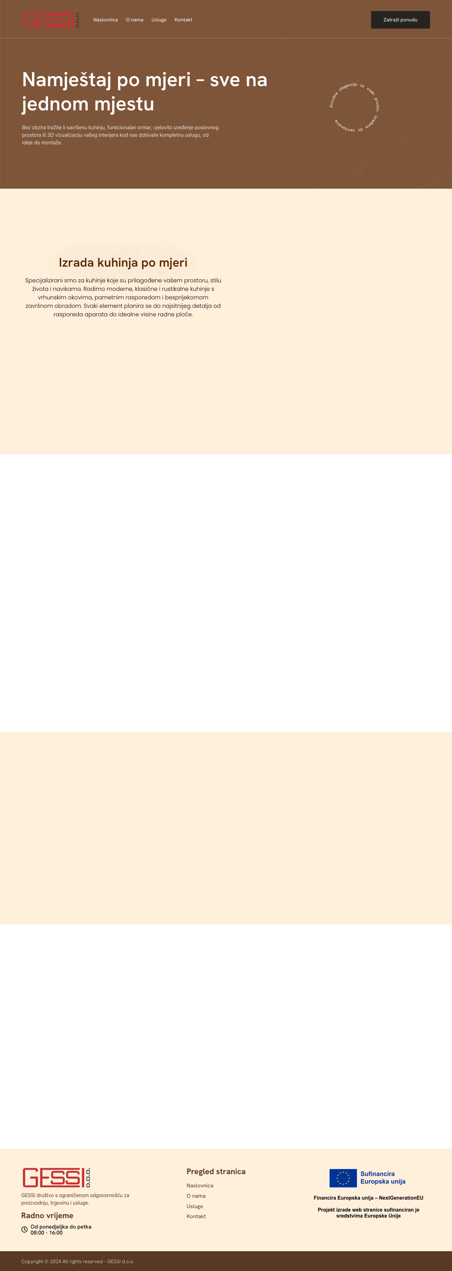 Tvrtka pruža širok spektar usluga uključujući izradu kuhinja po mjeri, ugradbene ormare, namještaj za dom i poslovne prostore, radne ploče te 3D vizualizaciju projekata. Gessi d.o.o. ne vjeruje u gotova rješenja - svaki projekt oblikuje prema specifičnom prostoru, stilu i potrebama klijenata.Kvaliteta i preciznost u svakom detalju