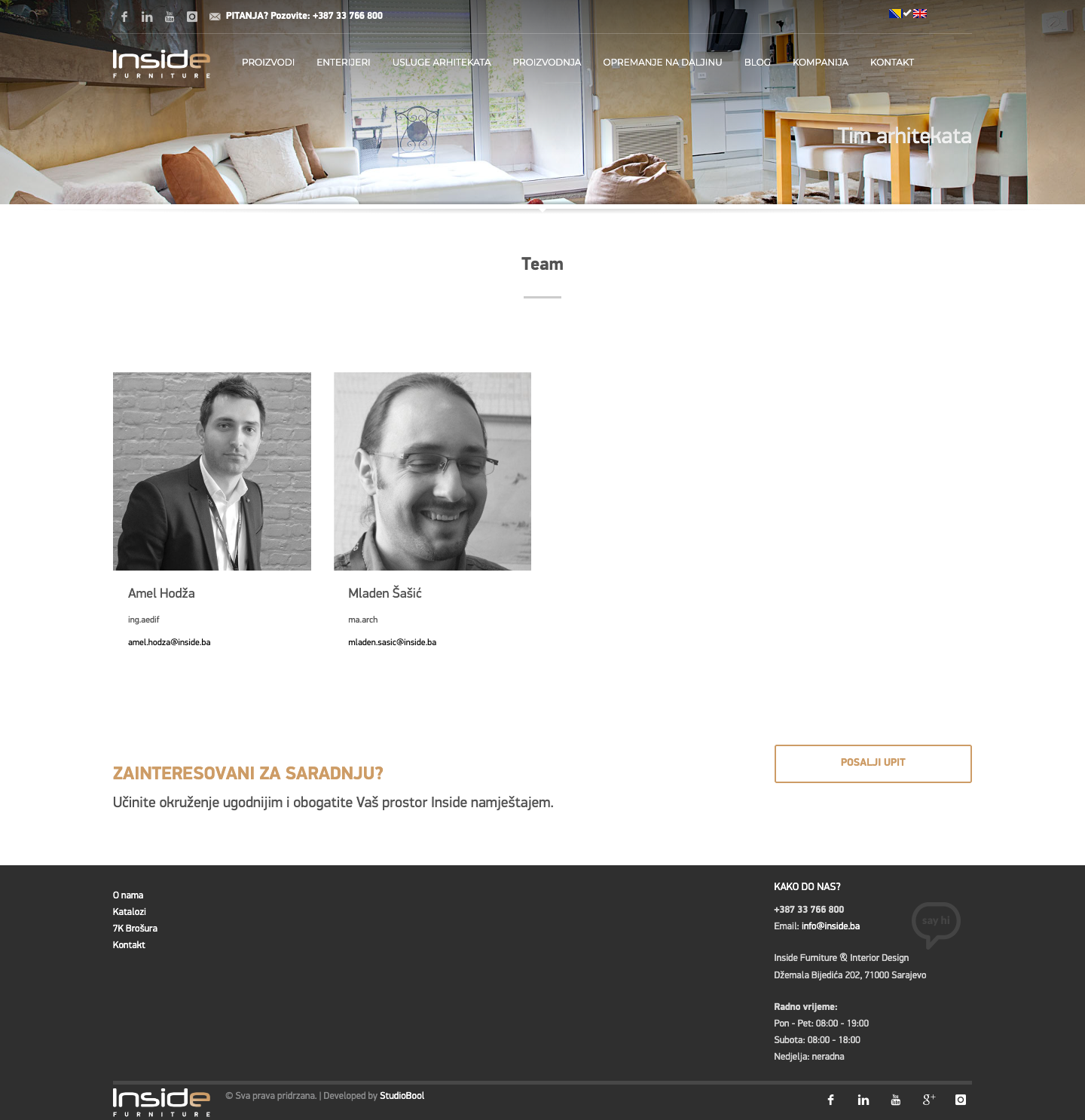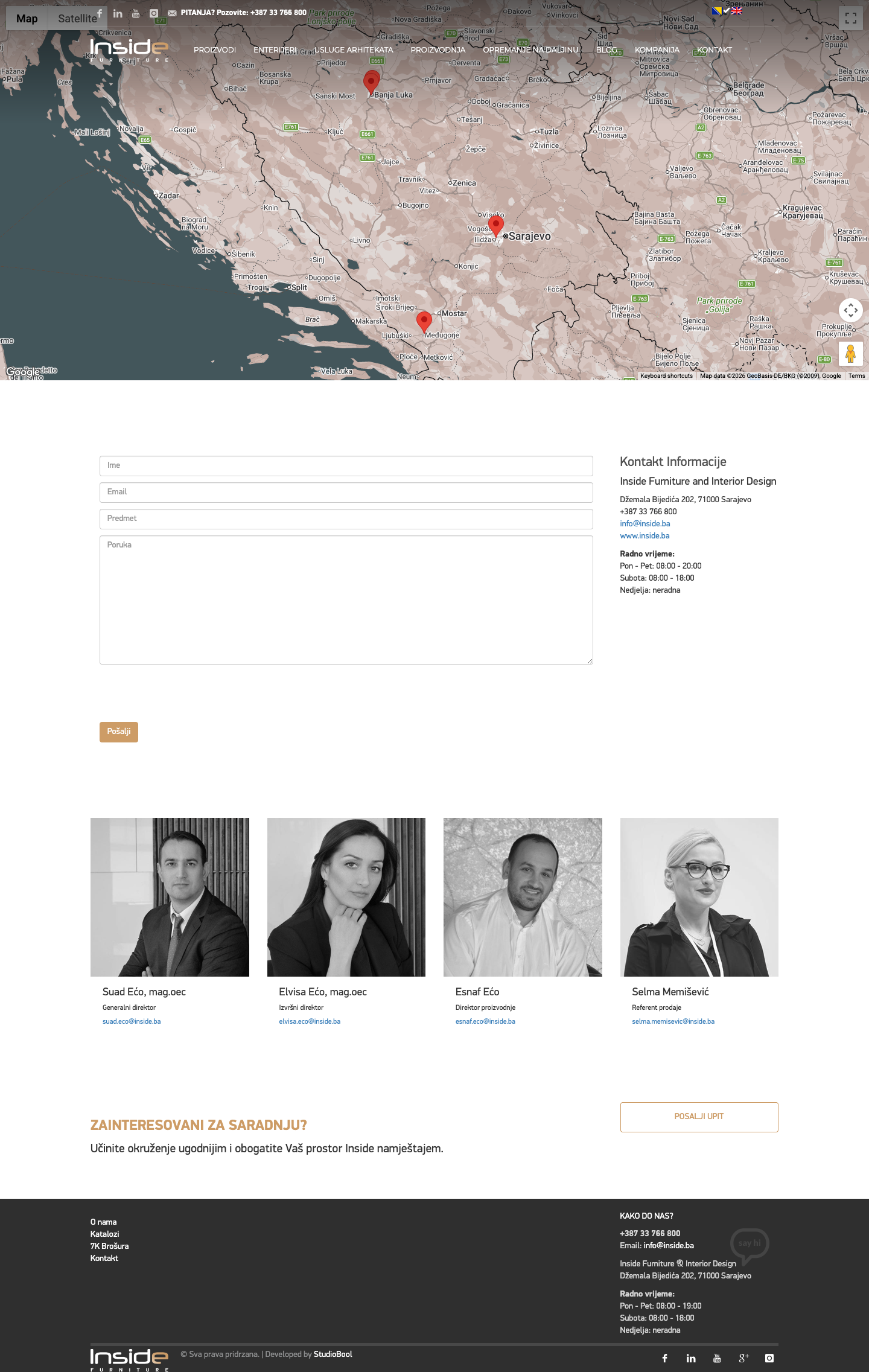 Kupci mogu kontaktirati Inside Namještaj Sarajevo putem službene web stranice inside.ba ili direktno na email adresu info@inside.ba. Za personalizirane upite dostupni su i specijalizirani kontakti uključujući amel.hodza@inside.ba, mladen.sasic@inside.ba, suad.eco@inside.ba, elvisa.eco@inside.ba, esnaf.eco@inside.ba i selma.memisevic@inside.ba.