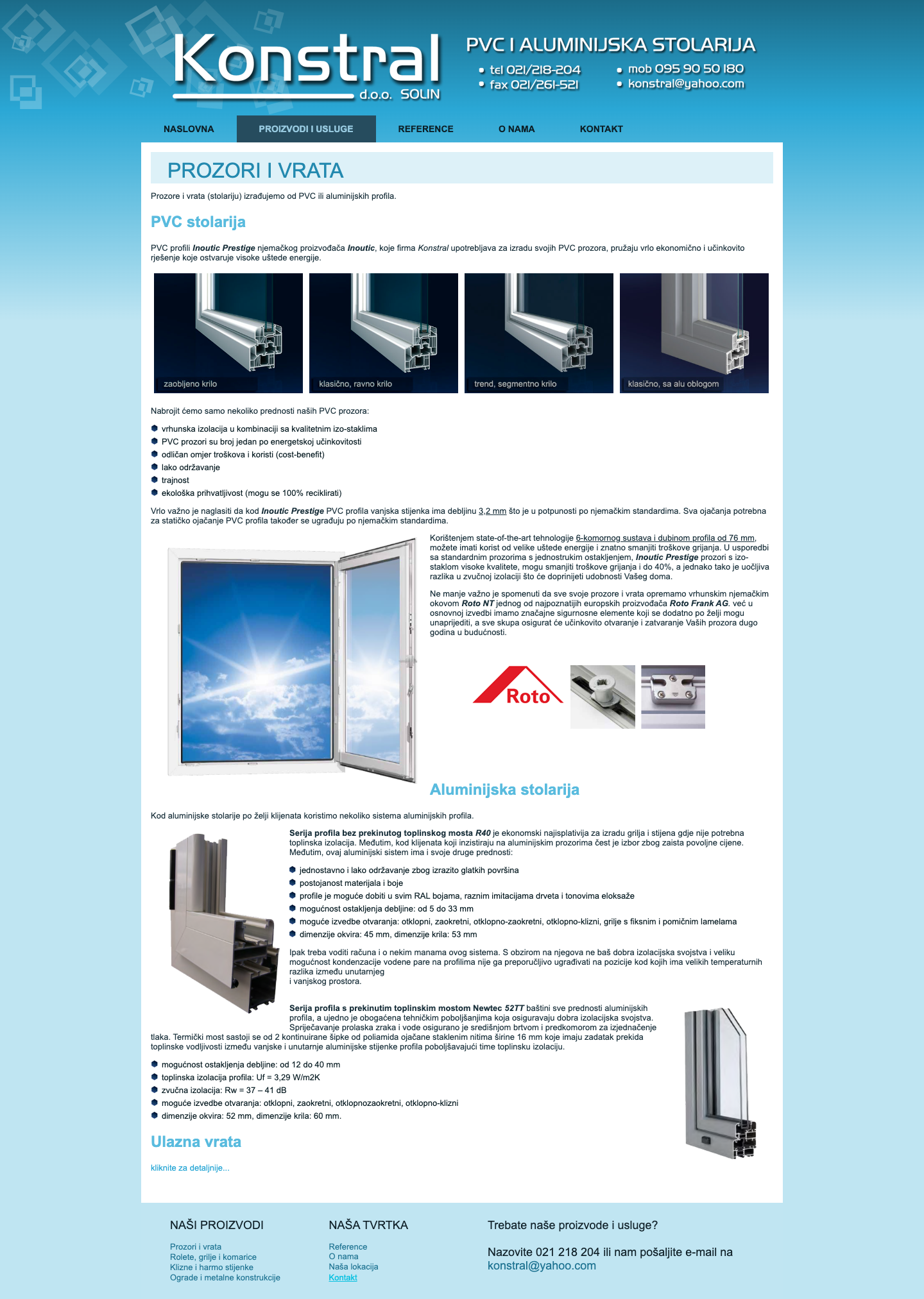 Nudimo sveobuhvatan asortiman proizvoda uključujući prozore i vrata izrađene od visokokvalitetnih profila, ostakljene izo-staklom s visokim stupnjevima termo-zvučne izolacije. Koristimo 6-komorni Inoutic Prestige PVC profile ugradbene dubine 76 mm i njemački okov Roto NT za maksimalnu kvalitetu. Specijalizirani smo za rolete, grilje i komarice koje pružaju najučinkovitije zasjenjivanje unutrašnjih prostora i sigurnosnu zaštitu. Također izrađujemo klizne i harmo stijenke u PVC i aluminijskim izvedbama, kao i različite ograde za balkone i stubišta te čelične i aluminijske konstrukcije za nadstrešnice i zimske vrtove.Projektiranje, montaža i jamstvo