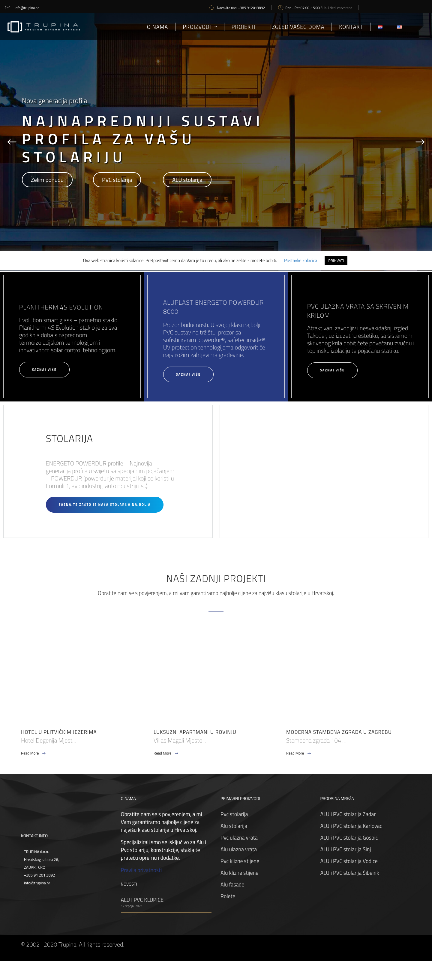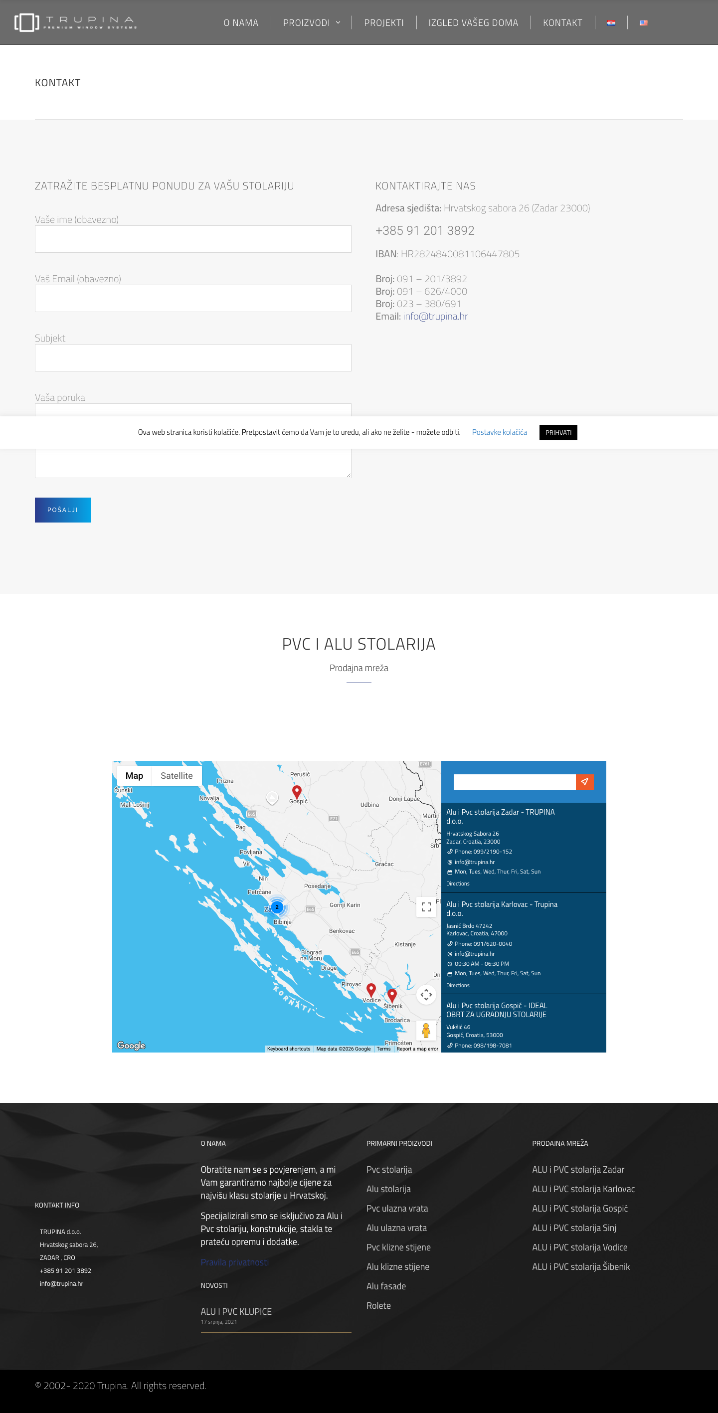 Tvrtka se nalazi u Zadru na adresi Hrvatskog sabora 26, a radi ponedjeljak do petak od 07:00 do 15:00. Za sve informacije možete ih kontaktirati na telefon +385 912013892 ili email info@trupina.hr. Obratite im se s povjerenjem - garantiraju najbolje cijene za najvišu klasu stolarije u Hrvatskoj.