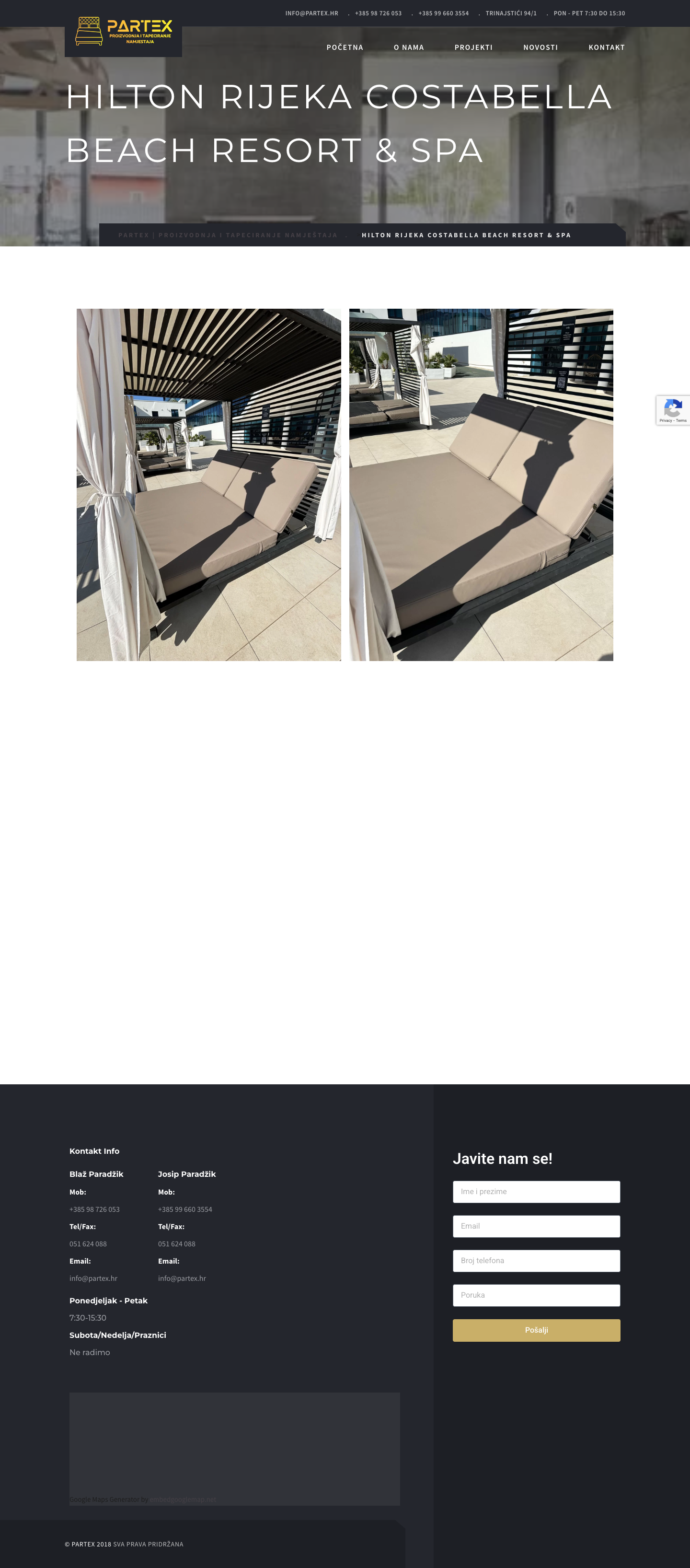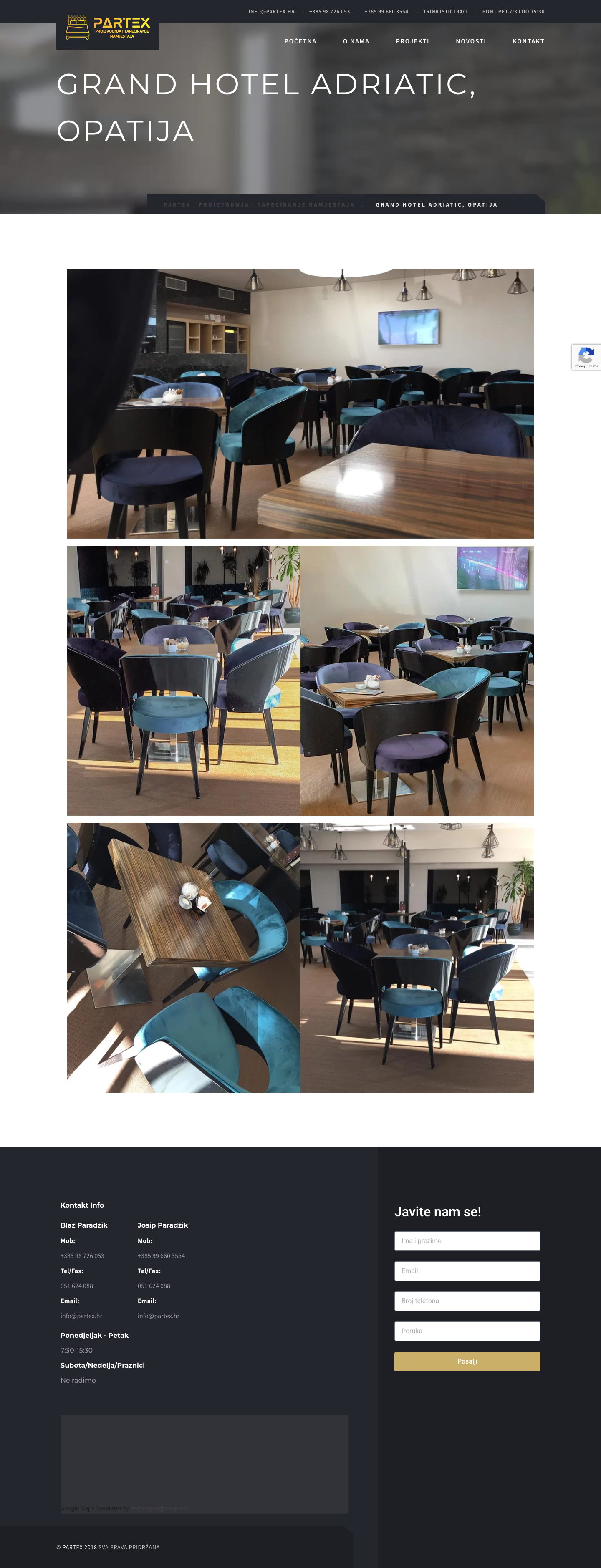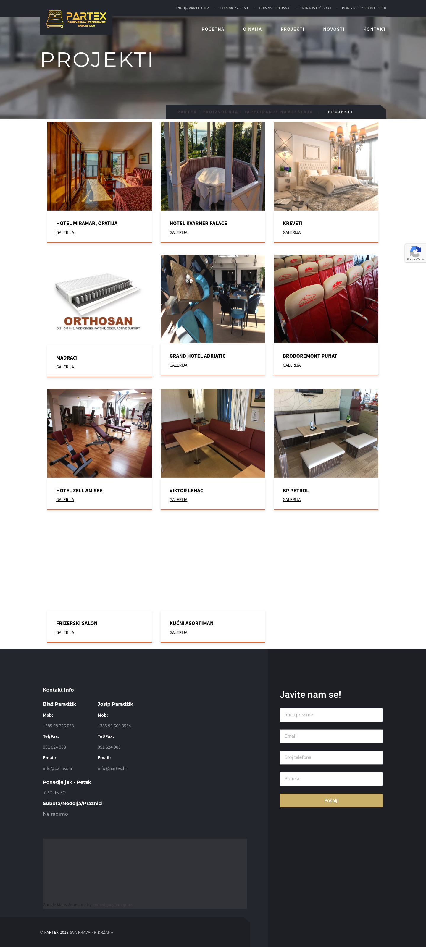 PARTEX nudi širok spektar usluga uključujući separee po mjeri, krevete po mjeri, bedroom namještaj i kućni asortiman. Kompanija je također radila na projektima za brodogradilišta Viktor Lenac, Brodoremont Punat Dalmont, te različite ugostiteljske objekte poput Konoba Zijavica, Restoran Lumber Opatija, Bistro Mornar Rijeka i Night Club Indigo Rijeka.Kontakt i Radno Vrijeme