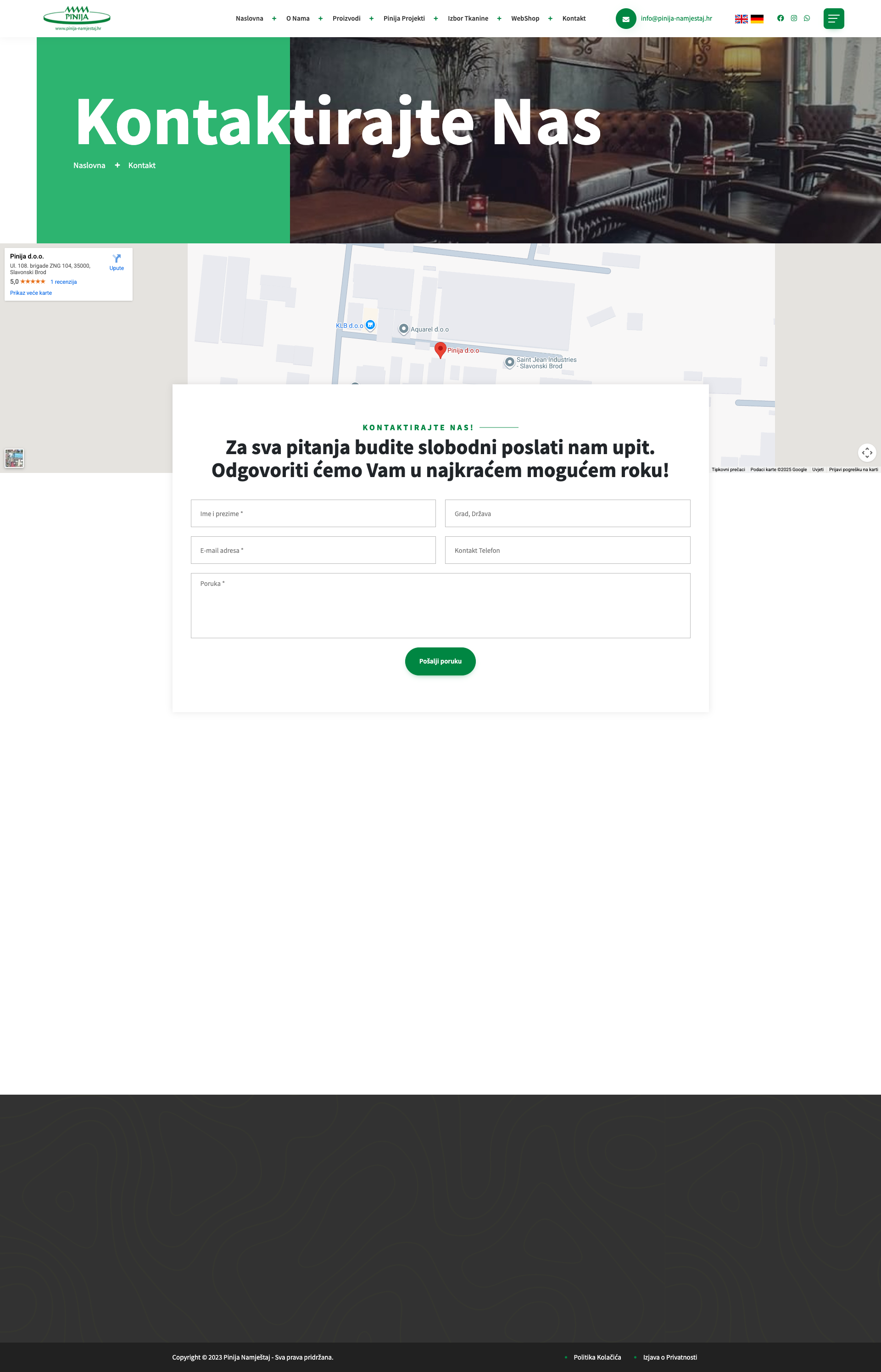 Pinija namještaj d.o.o., smješten u Slavonskom Brodu, Hrvatska, već više od 20 godina prednjači u proizvodnji kvalitetnog tapeciranog namještaja. Osnovan 1998. godine, podjetje se ponosi obiteljskom tradicijom i posvećenošću detaljima. S naglaskom na inovativan dizajn i vrhunsku izradu, Pinija namještaj d.o.o. nudi širok asortiman proizvoda uključujući garniture, sofe, fotelje, bračne ležaje, madrace i stolice.