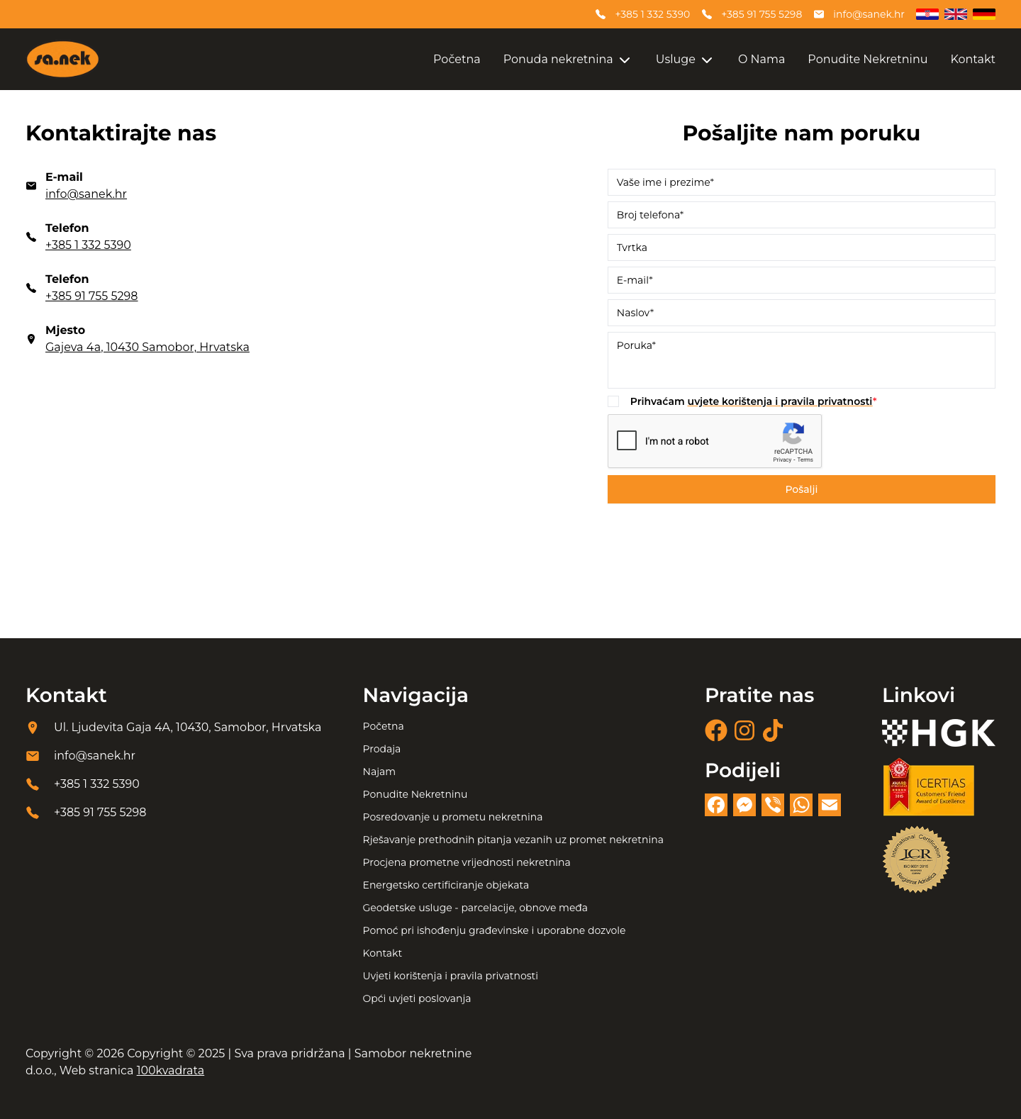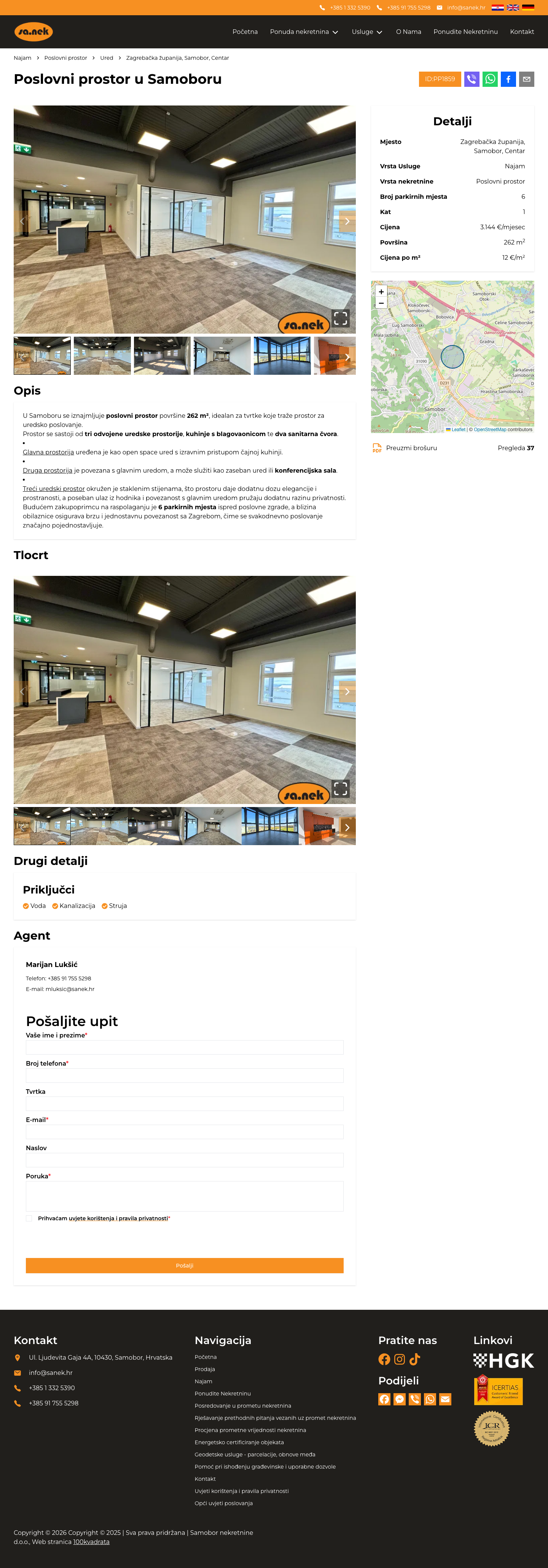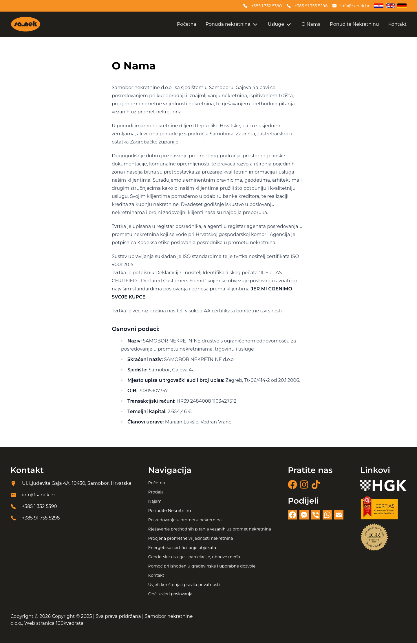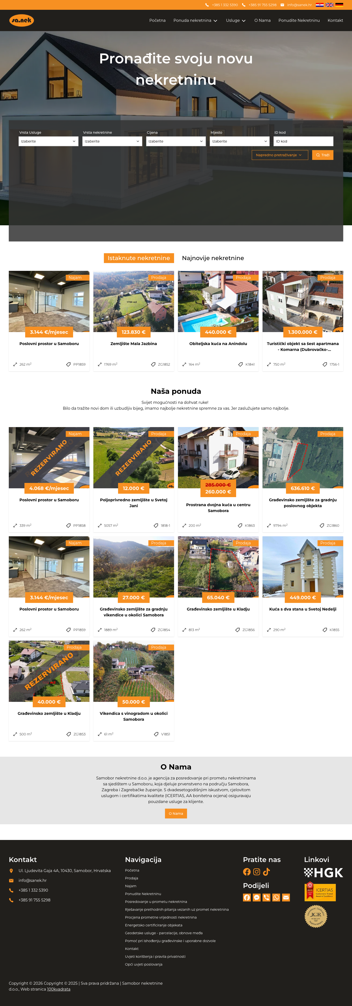 Sa.nek, poznat kao Samobor nekretnine d.o.o., je renomirana agencija za posredovanje u prometu nekretninama sa sjedištem u Samoboru, Gajeva 4a. S dvadesetogodišnjim iskustvom u poslovanju nekretninama, tvrtka se specijalizirala za kupoprodaju i iznajmljivanje nekretnina, ispitivanje tržišta te procjenu prometne vrijednosti nekretnina.Područje djelovanja i ponuda