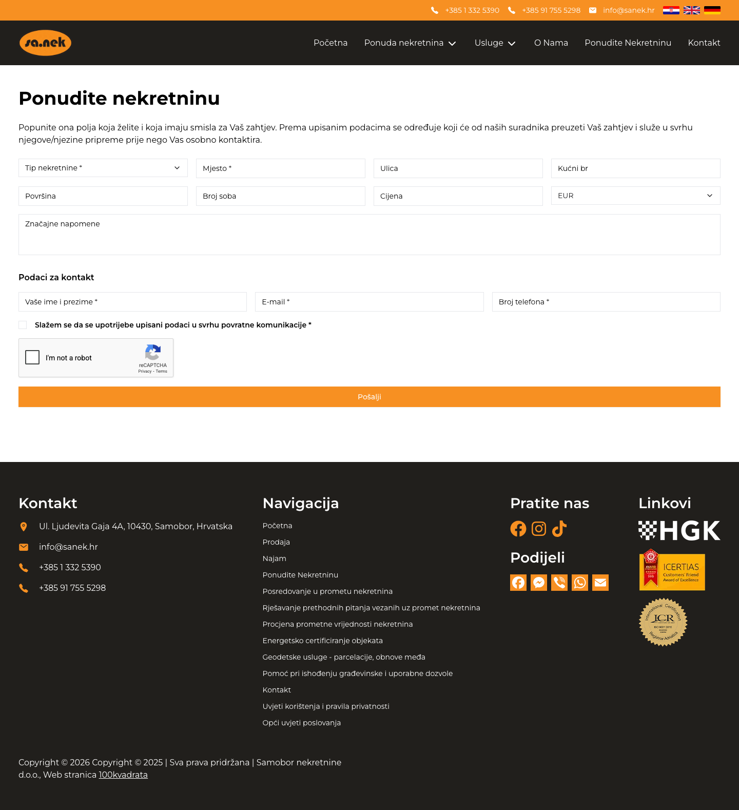 Sa.nek pruža procjenu prometne vrijednosti nekretnina, energetsko certificiranje objekata, geodetske usluge, pomoć pri ishođenju dozvola te pomoć pri odabiru banke i realizaciji kredita.