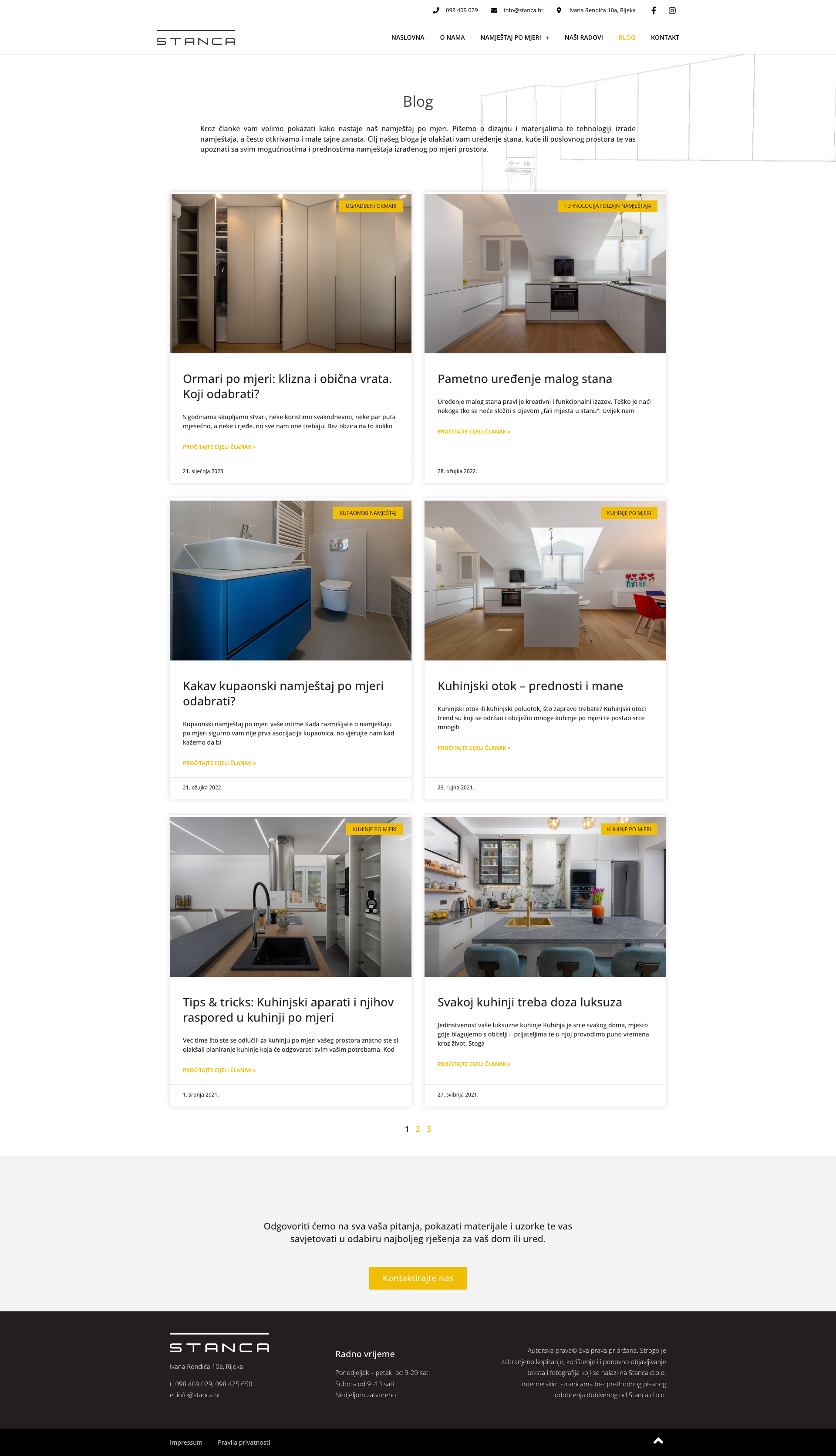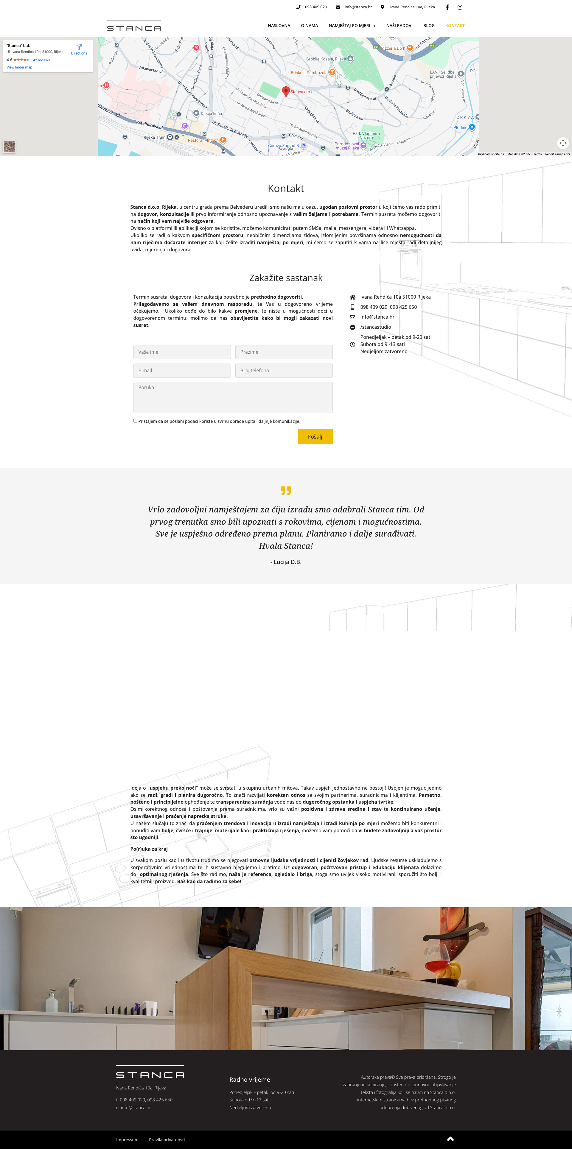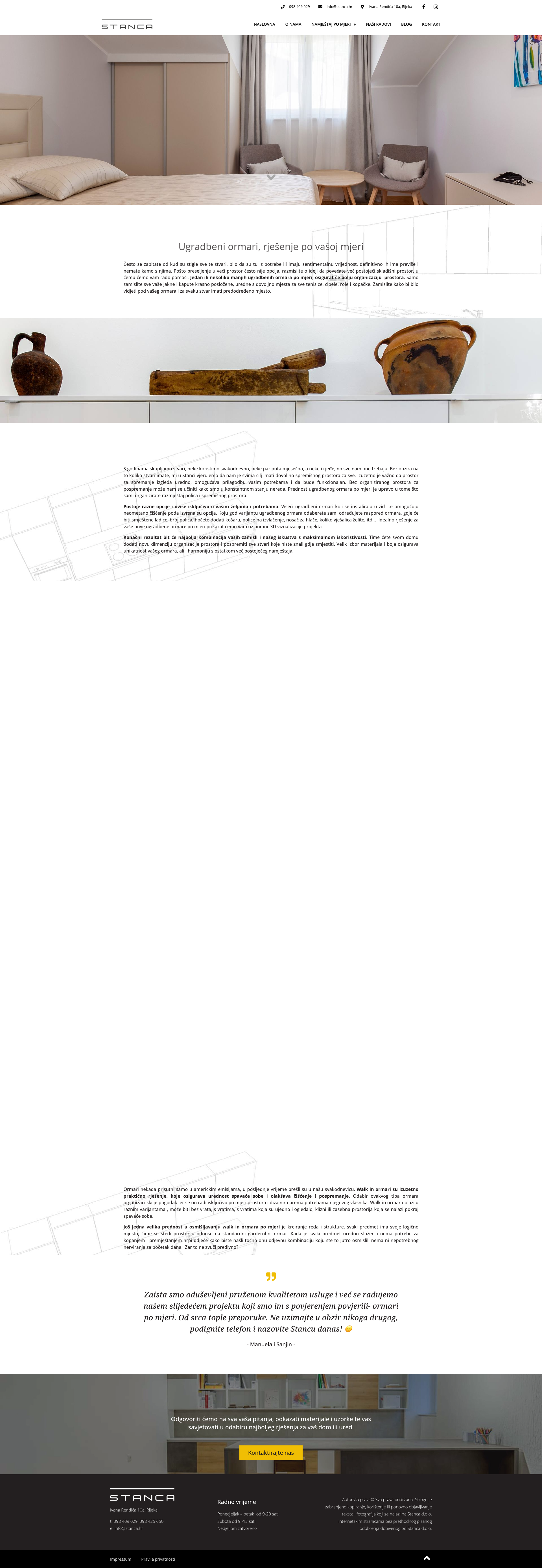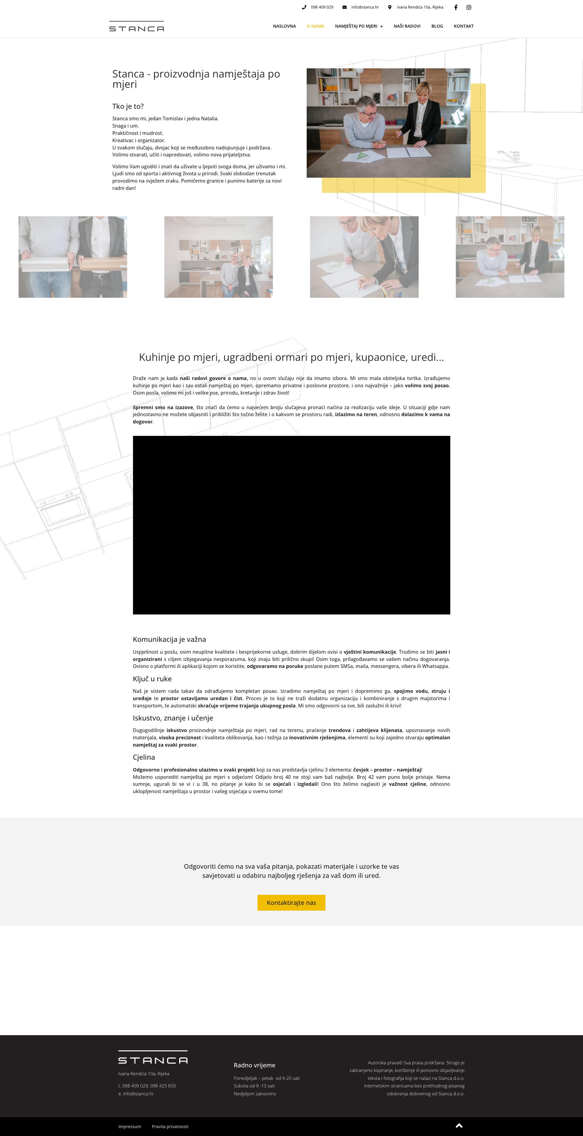 "Stanca" Ltd. je obiteljska tvrtka smještena u Rijeci, Hrvatska, specijalizirana za izradu namještaja po mjeri. Tvrtka se ističe svojom posvećenošću kvaliteti i prilagodljivosti, što je čini idealnim izborom za sve koji traže jedinstvene i funkcionalne interijere. S dugogodišnjim iskustvom u proizvodnji kuhinja, ugradbenih ormara i raznih drugih vrsta namještaja, "Stanca" Ltd. uvijek stavlja naglasak na zadovoljstvo klijenata.