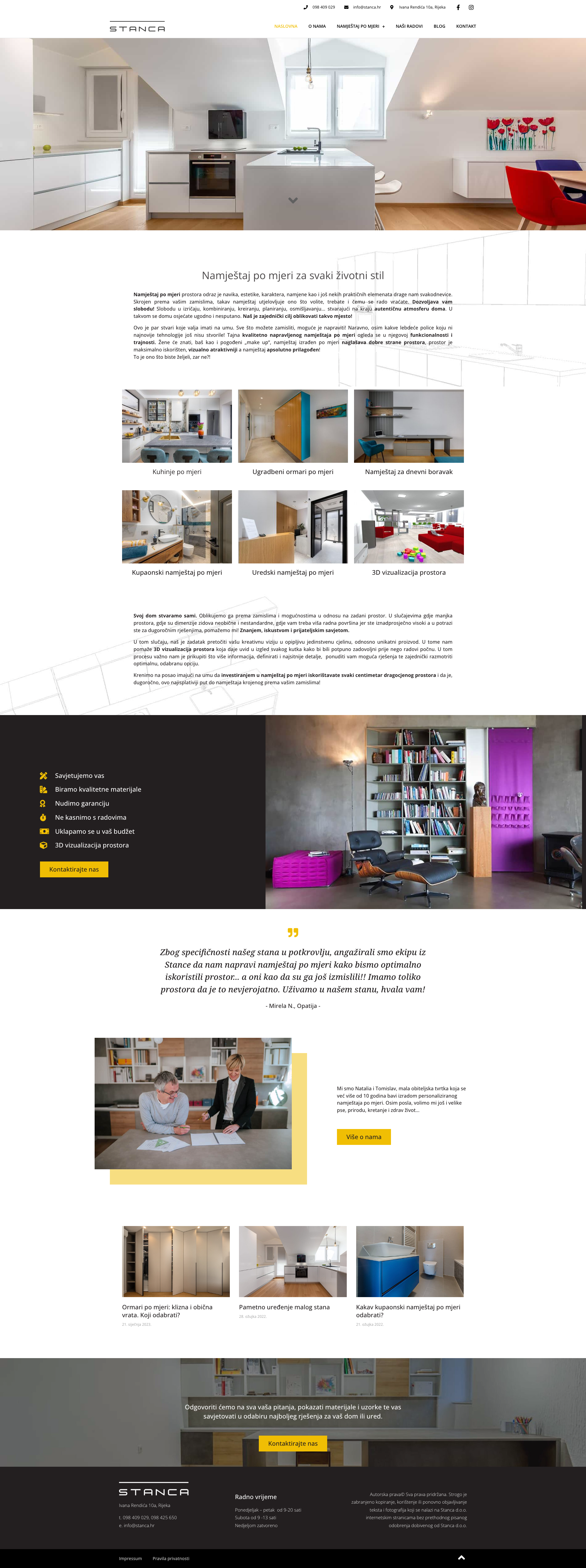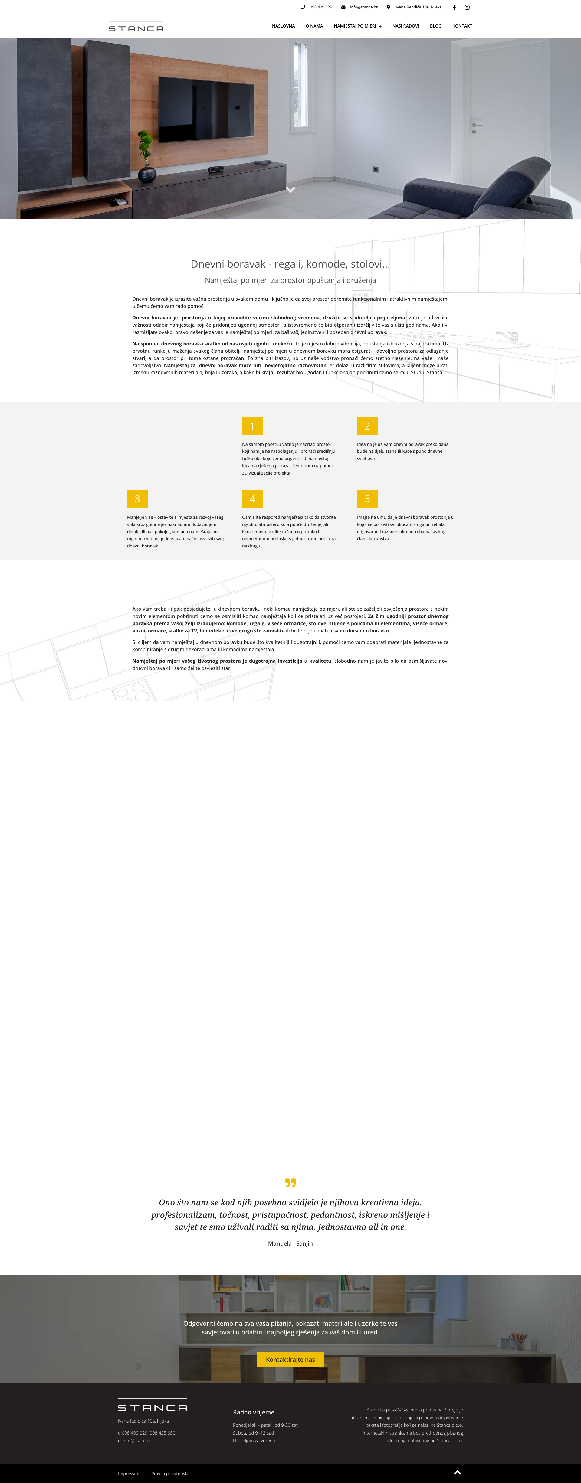 "Stanca" Ltd. nudi jedinstvenu prilagodbu svakog komada namještaja vašem prostoru, a tim stručnjaka pruža personalizirane usluge savjetovanja i dizajna. Ako tražite pouzdanog partnera za opremanje doma ili ureda u Rijeci i šire, kontaktirajte "Stanca" Ltd. putem info@stanca.hr ili telefonom na 098 409 029. Posjetite njihovu web stranicu stanca.hr za više informacija.