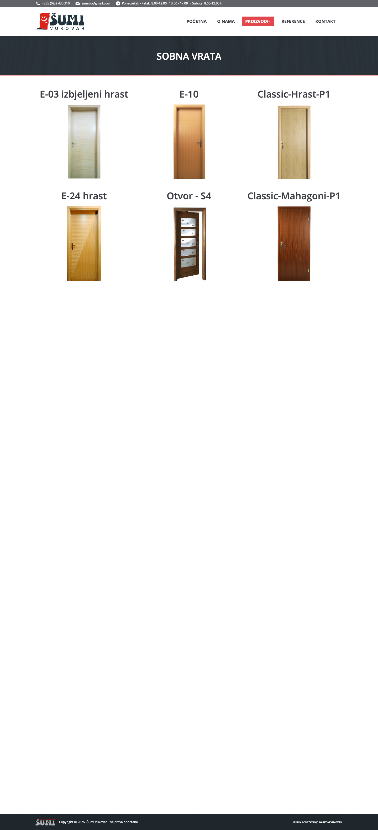 Šumi nudi preko 30 modela sobnih vrata u svim vrstama furnira, uključujući hrast, bukvu, mahagoni, jasen, orah, trešnju, venge i izbjeljeni hrast. Svi proizvodi izrađeni su od visokokvalitetnih materijala proizvedenih i atestiranih u Hrvatskoj (proizvodnja Javor – Patkovac), što omogućuje dvogodišnju garanciju na sve proizvode.Profesionalna Ugradnja i Usluge