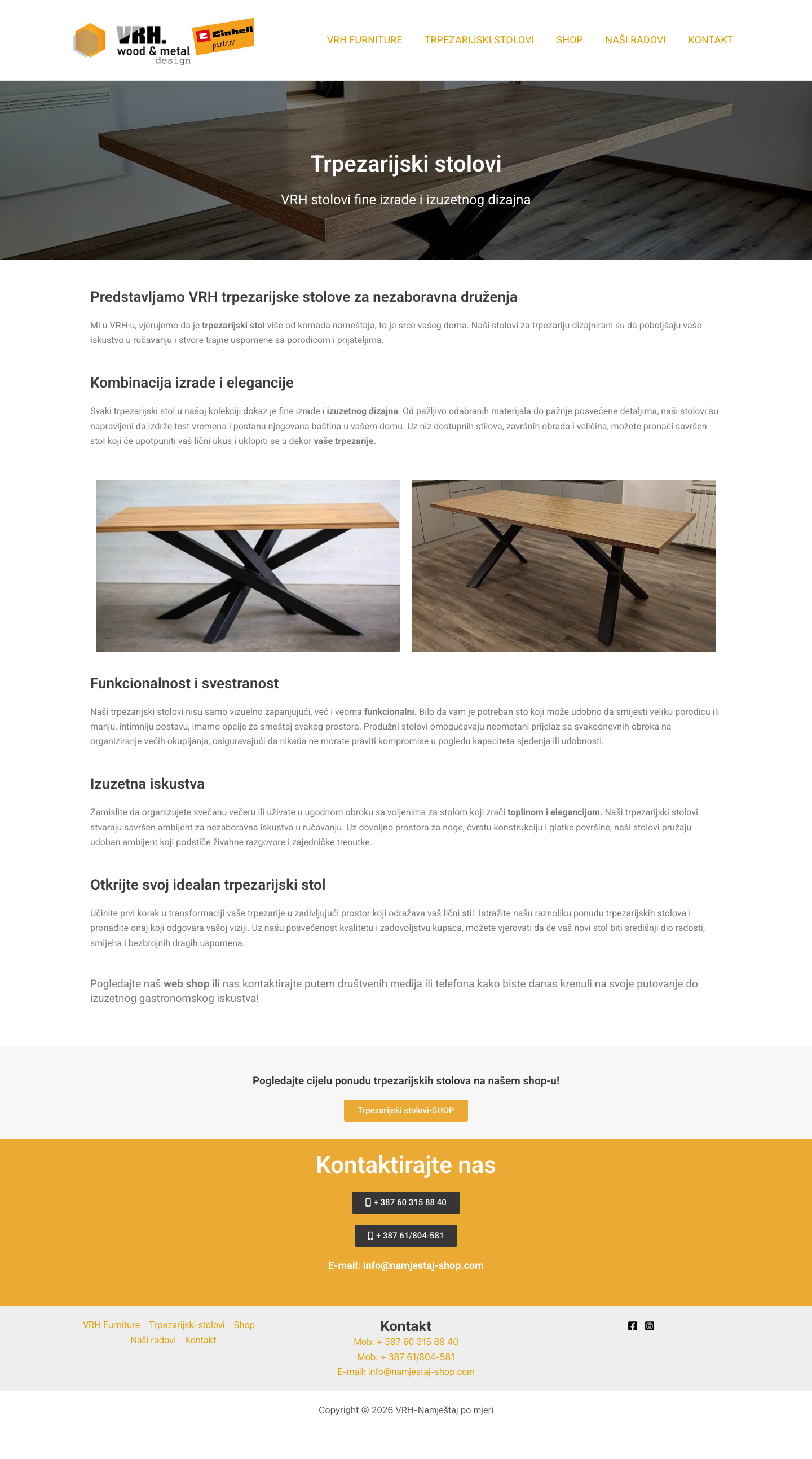 Koristimo moderne tehnologije uključujući lasersko mjerenje prostora i 3D modeliranje prije same izrade. Vršimo isporuku širom Bosne i Hercegovine, a trpezarijske stolove šaljemo i širom Europe. Na sve naše proizvode i usluge dajemo garanciju. Kontaktirajte nas putem naše web stranice https://namjestaj-shop.com/ i započnite svoju priču po mjeri s VRH-Wood & Metal.